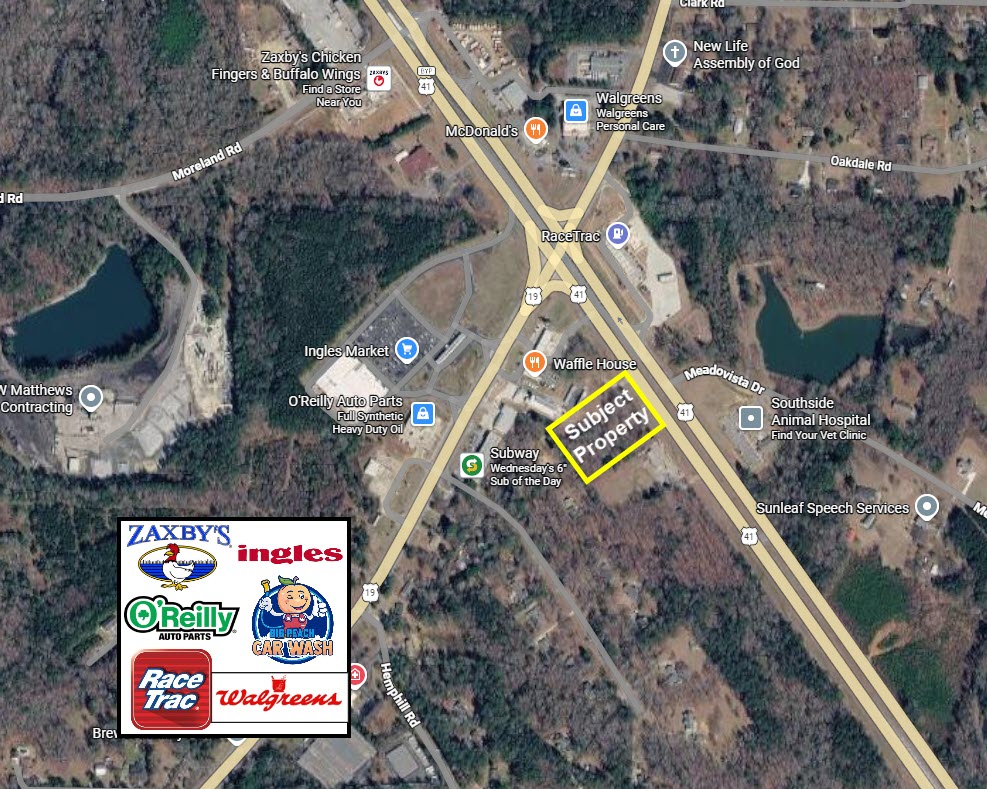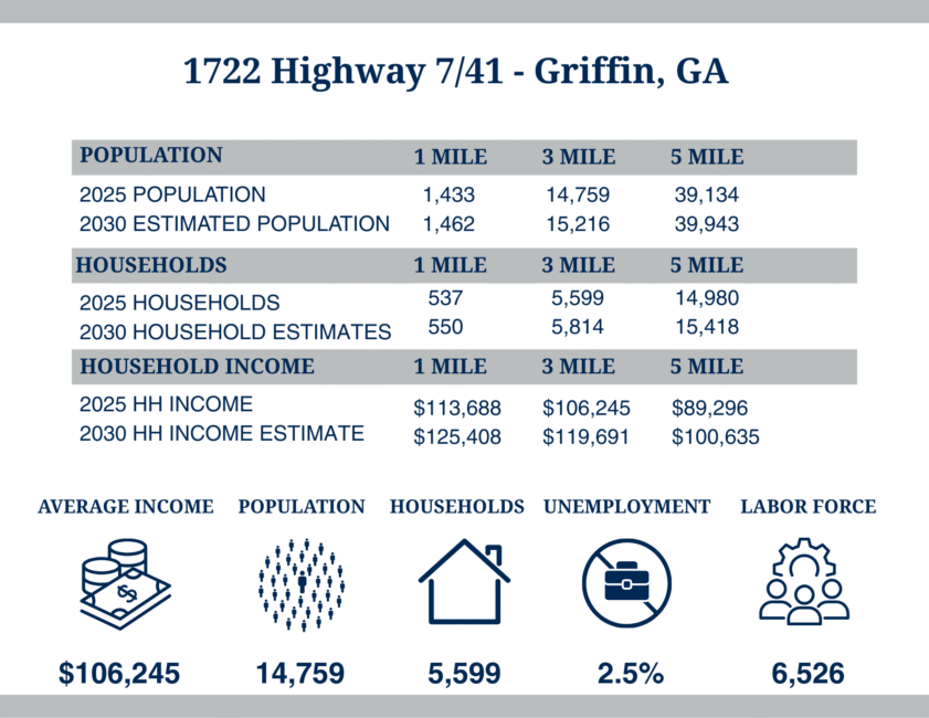 Located just ±4 miles from Downtown Griffin, the site benefits from excellent visibility, convenient accessibility, and a strong surrounding customer base. With an estimated 15,800 vehicles per day (2021 GDOT) traveling along Highway 7/41, the property offers significant exposure in a busy, well-established commercial corridor. The combination of strong traffic counts, solid area demographics, and proximity to established residential neighborhoods positions this site as an ideal opportunity for self-storage or complementary commercial development.