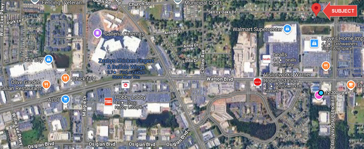 • Traffic: Traffic Count (GDOT 2024) Carl Vinson Parkway - 12,300 VPD; Watson Boulevard 37,400 VPD