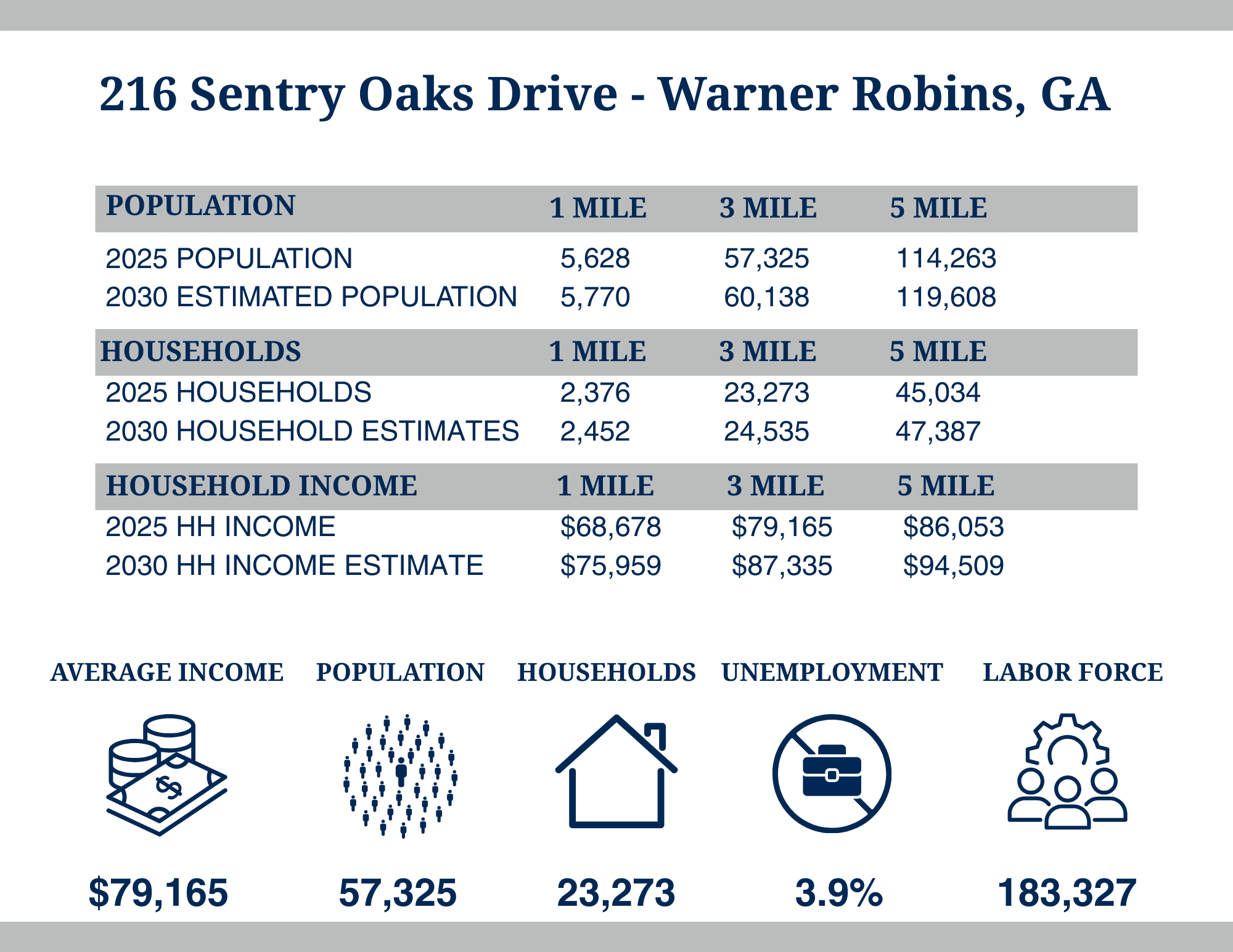 This property is surrounded by a strong mix of national retailers and restaurants, including Walmart, Kroger, ALDI, Lowe’s, Home Depot, Chick-fil-A, and Truist Bank, the site is ideally positioned to capture consistent consumer traffic in one of Houston County’s most active commercial areas.