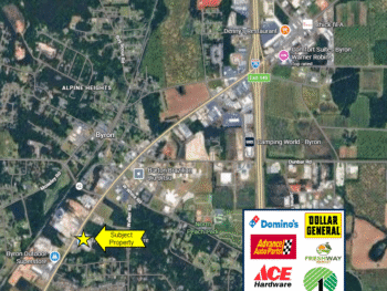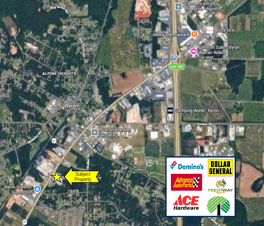Positioned along the highly traveled Highway 49 corridor in Byron, this ±2,700 SF retail opportunity at 231 Highway 49 offers two adjacent suites (400 & 500) that can be combined or subdivided to accommodate a variety of users. The property features a flexible layout, ample on-site parking, and strong visibility with prominent signage opportunities, making it ideal for retail, office, or service-oriented businesses. Surrounded by national retailers and supported by a strong daytime population, the site benefits from consistent consumer traffic and a proven commercial environment. With direct access to Highway 49 and close proximity to Interstate 75, the location provides excellent connectivity between Macon and Warner Robins, placing tenants in the path of over 10,000 vehicles per day on Highway 49 and more than 86,000 vehicles per day on I-75. Situated within a rapidly growing commercial corridor in Peach County, this property offers both immediate exposure and long-term growth potential.