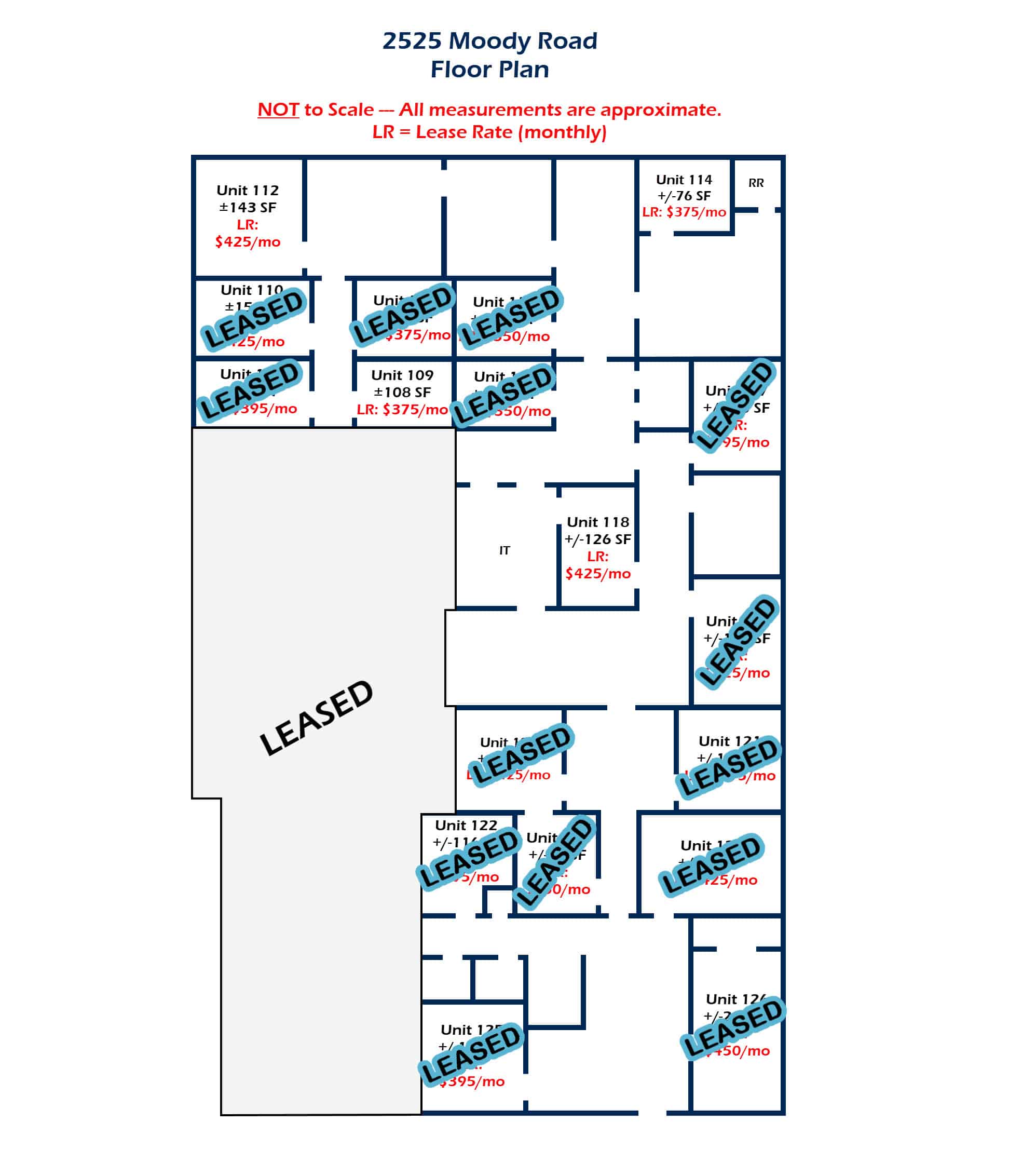 Positioned at 2525 Moody Road in Warner Robins, this ±6,790 SF multi-tenant office property offers four vacant suites with the ability to combine units for larger users, making it ideal for professional, medical, or service-based businesses seeking flexibility and efficiency. The space features shared restrooms and a common break room, while full-service lease rates starting at $375 per month include Wi-Fi and janitorial service in common areas, helping tenants control overhead and simplify operations. The property provides ample on-site parking and is strategically located near the intersection of Moody Road and Feagin Mill Road with quick access to Highway 96 and close proximity to Robins Air Force Base, placing businesses in the heart of one of Houston County’s most active commercial corridors.