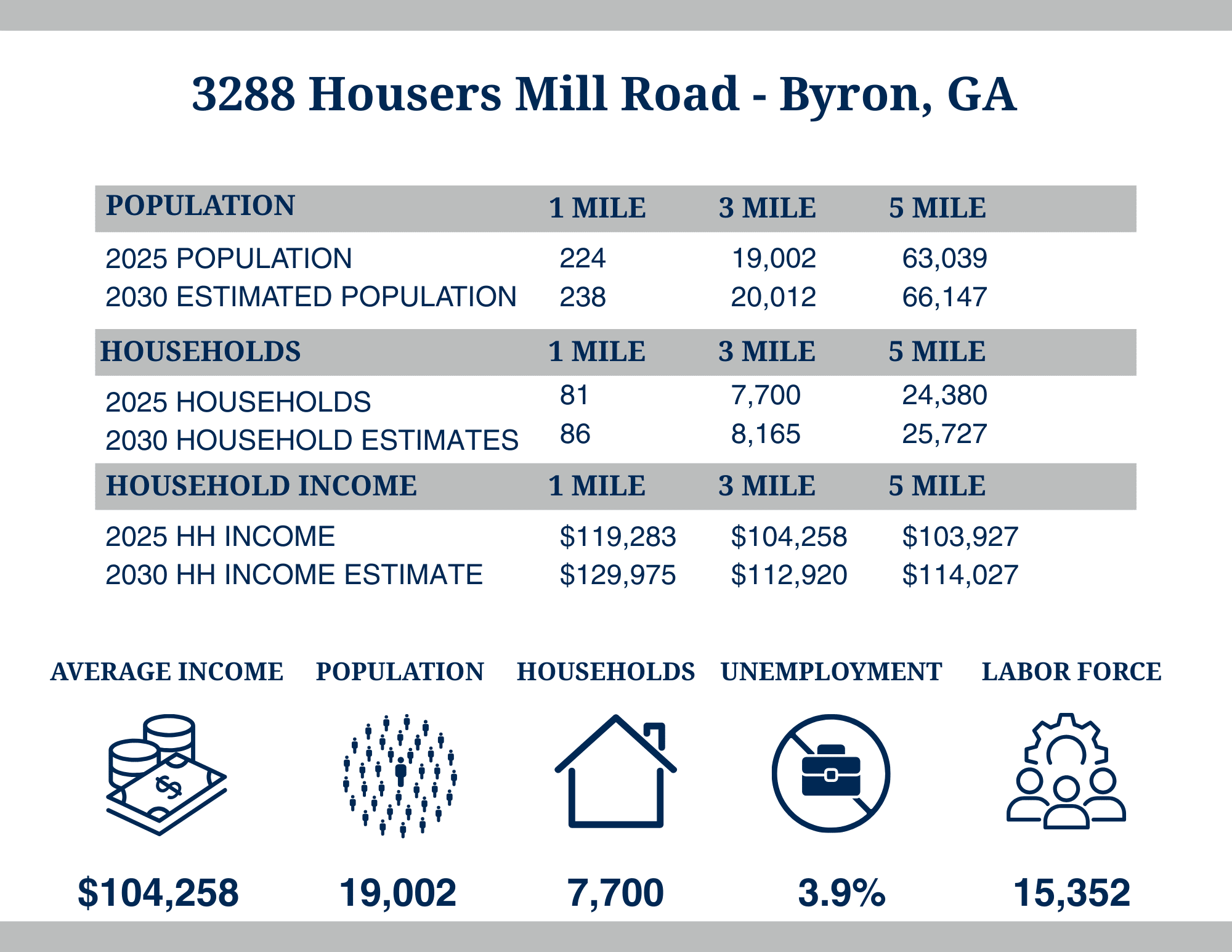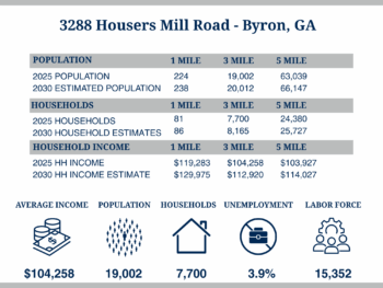 - Traffic: Traffic County (GDOT 2024:) I-75 North-80,600 VPD/I-75 South-86,400 VPD