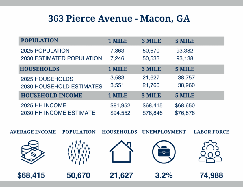 - Traffic: Traffic Counts (GDOT 2021 Published Data estimate) Pierce Avenue– 9,070 VPD Vineville Avenue– 21,800 VPD