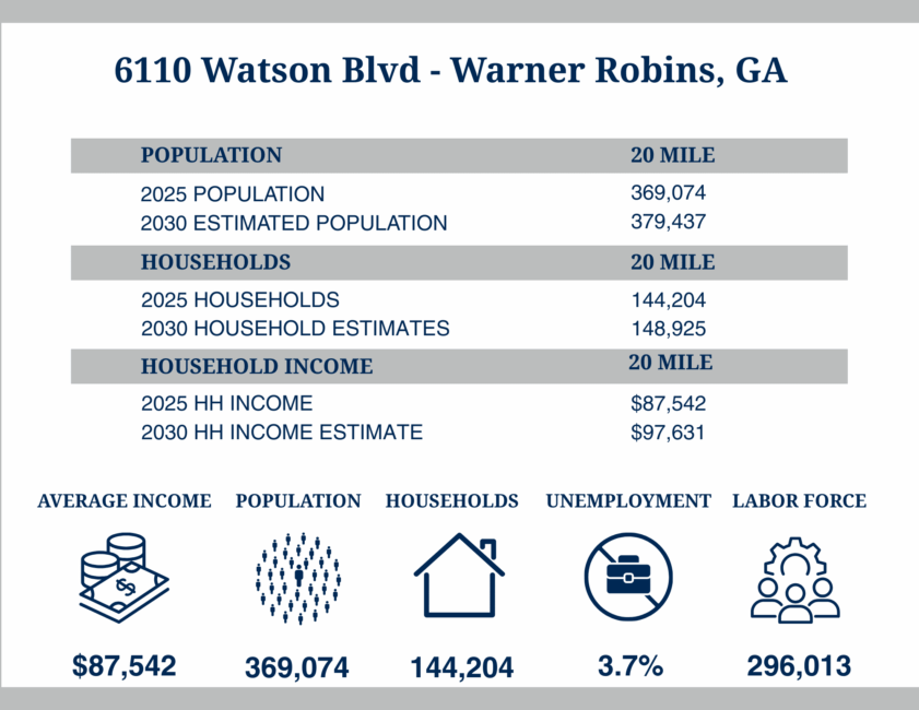 - Traffic: Traffic Count (GDOT 2023:) Watson Boulevard - 22,600 VPD / I-75 North (Exit 146) - 86,400 VPD