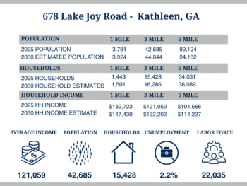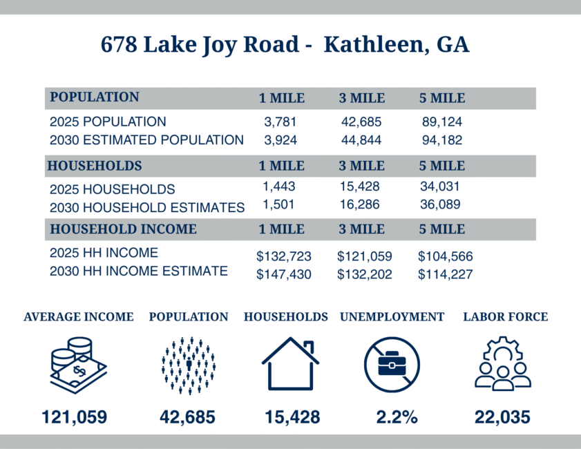 This ±3,000 SF retail space at 678 Lake Joy Road in Kathleen, GA offers a strong opportunity in one of Houston County’s growing commercial corridors. Situated on approximately 1.05 acres, the property features ample parking and a flexible layout, previously occupied by Brown’s Eye Center. Located at the signalized intersection of Lake Joy Road and Highway 96, the site provides excellent visibility with a combined traffic count of over 36,000 vehicles per day. The surrounding area includes well-known retailers and restaurants such as Firehouse Subs and Freddy’s Frozen Custard & Steakburgers, along with nearby destinations like Lowe’s, Rigby’s Entertainment Complex, and Houston Lake Cinemas. Offered at $30/SF, NNN, this space benefits from strong local demographics, steady residential growth, and a high-traffic retail environment.