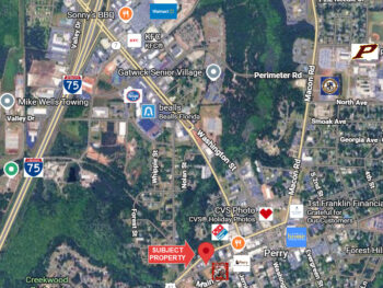 High visibility location in the heart of downtown Perry, just steps away from restaurants, retail and entertainment including BBQ Monsters To Go, Bodega Brew, Acres & Oaks Kitchen, Durden’s Prime Meats, Morris Bank, FitCo Health Club, The Perry Players Theatre and more.