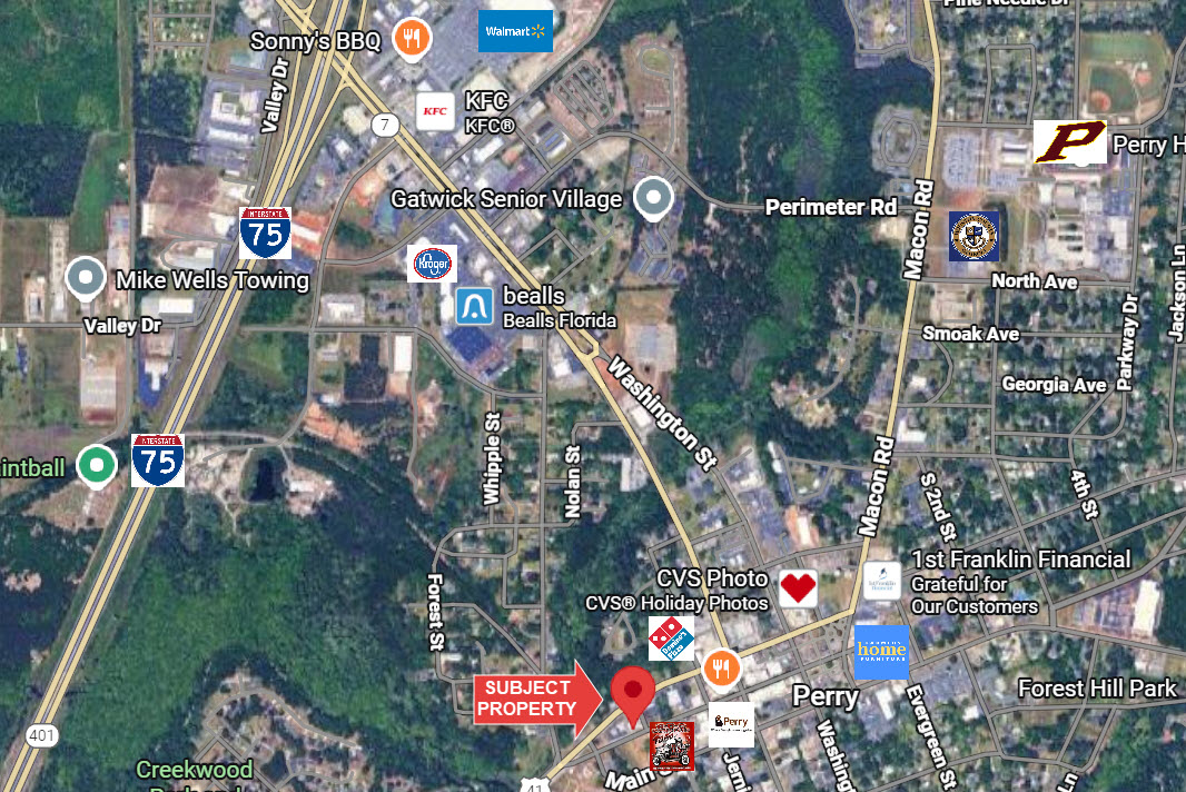 High visibility location in the heart of downtown Perry, just minutes from restaurants, retail, and entertainment including BBQ Monsters To Go, Bodega Brew, Acres & Oak Kitchen, Durden’s Prime Meats, Morris Bank, FitCo Health Club, The Perry Players Music Theatre and more.