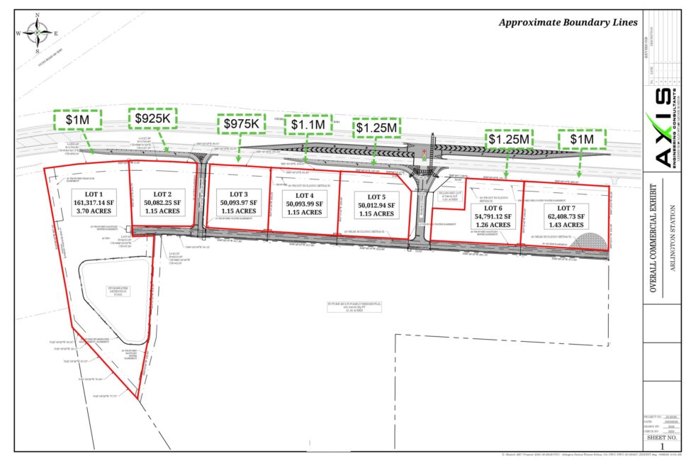 Seven out lots ranging from ±1.15 acres to ±3.70 acres with sites delivered pad-ready with all utilities, retention, and access to the entrance of Arlington Station